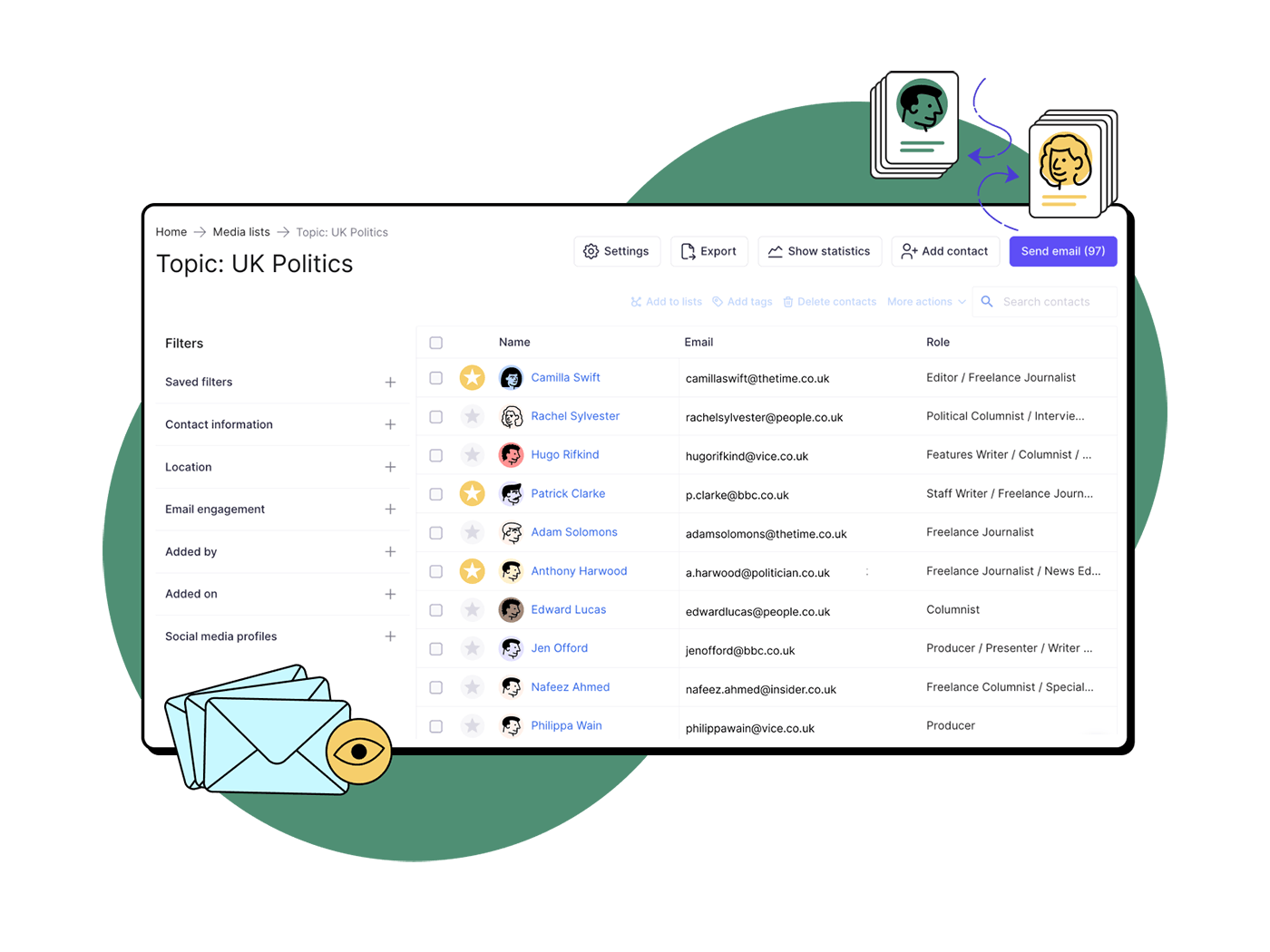 Browse over a million media contacts in Prowly’s Media Database to find relevant journalists and media outlets for your clients. Then, send personalized emails to your new contacts and start building long-lasting media relationships. All from one place.